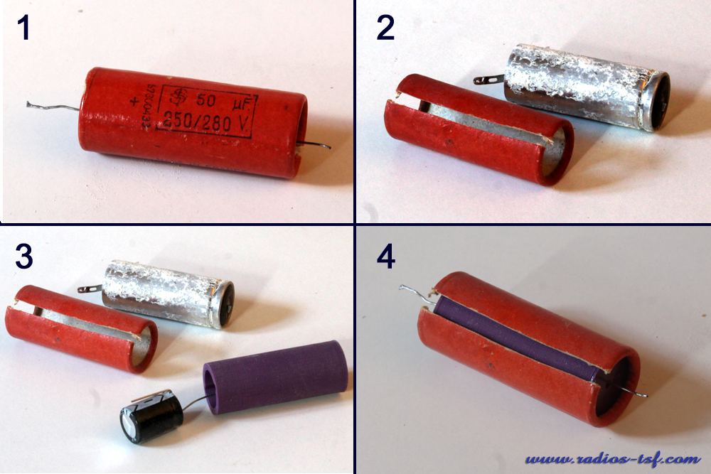 Donc pour garder l'aspect visuel, j'ai coupé au cutter l'enveloppe en carton des condensateurs d'origine et sorti la cartouche. Ensuite, après avoir imprimé un cylindre de même dimensions, j'ai introduit les condensateurs neufs puis recollé autour de la pièce imprimée l'enveloppe en carton d'origine.