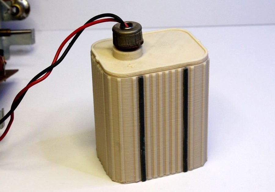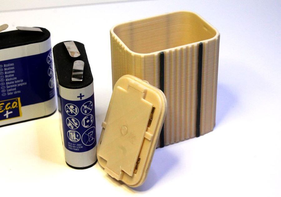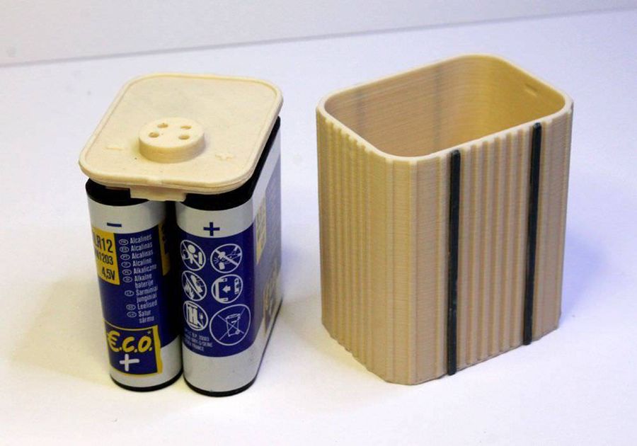 Coupleur pour deux piles plates type 3LR12 de 4,5 volts. Objets créés par une imprimante 3D, et comportent donc de fines stries (peu visibles sur la photo).