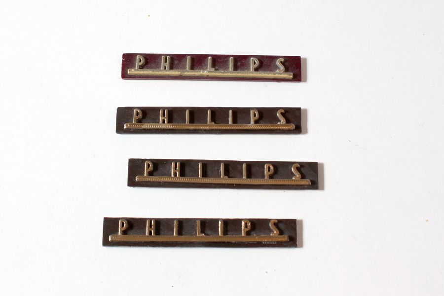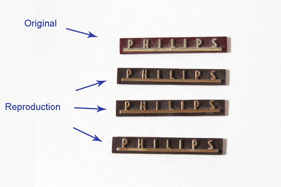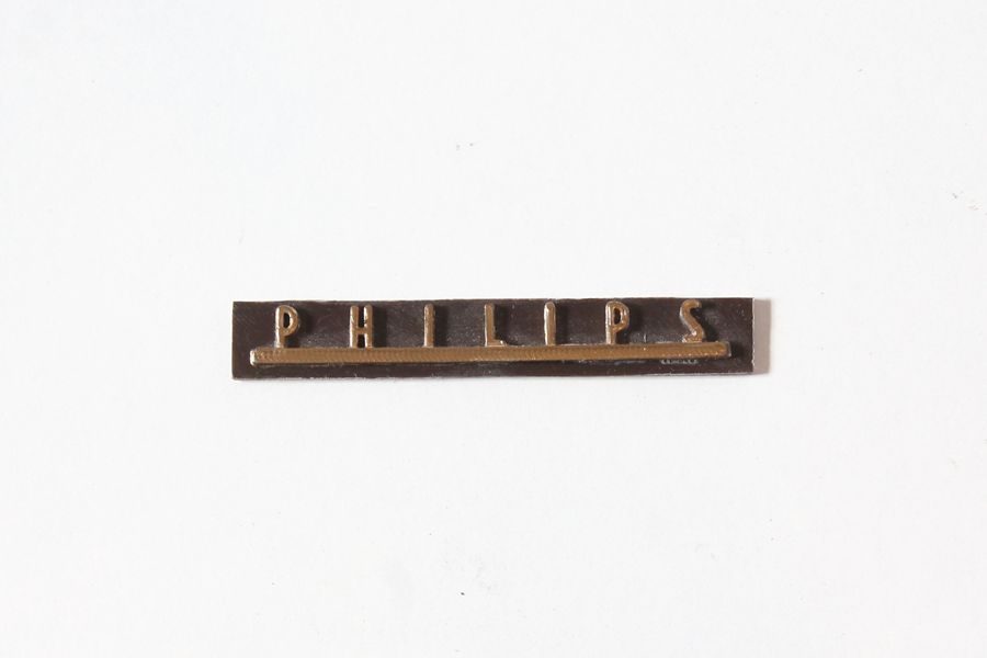 Logo "Philips" Utilisé sur le modèle B4F61A de Philips (peut-être d'autres également). Dimensions : 12,4 x 82 mm Une différence visible est la couleur plus claire de la reproduction. En photo poste de radio schneider des années 50 qui a utilisé ce modèle, mais il y en a d'autres. la livraison comprend un logo Philips ( photo N°1 ). Prix : 5,00 euros le logo - référence : phil-1-4